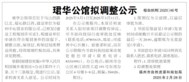 海西房产网(微信公众号:fjhxfcw)消息:2025年2月28日,福州市自然资源和规划局发布“珺华公馆拟调整公示”。