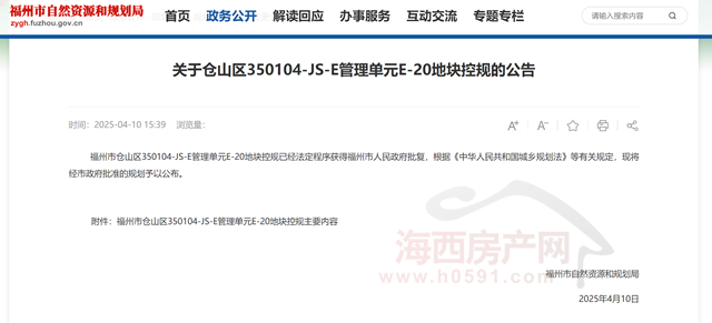 海西房产网(微信公众号:fjhxfcw)消息:2025年4月10日, 福州市自然资源和规划局发布“关于仓山区350104-JS-E管理单元E-20地块控规的公告”。