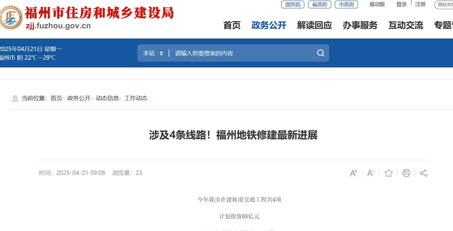 海西房产网(微信公众号:fjhxfcw)消息:2025年4月21日,福州市住房和城乡建设局报道了福州4条地铁线路修建的最新进展。