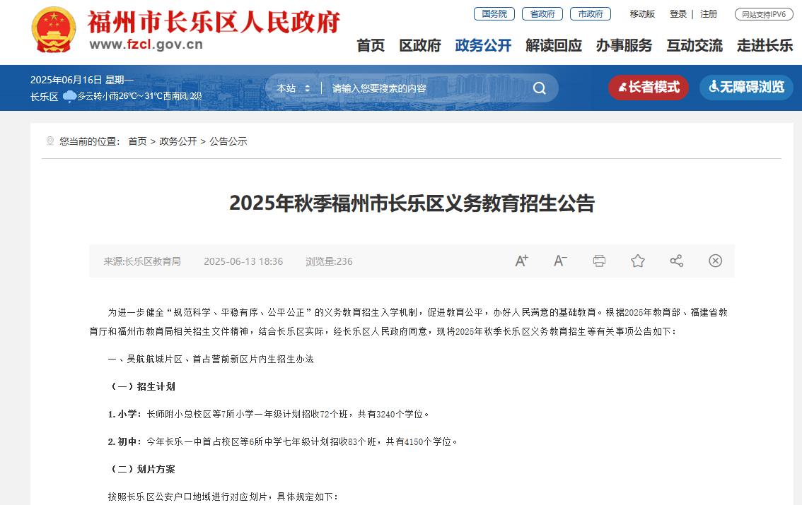 海西房产网(微信公众号:fjhxfcw)消息:2025年6月13日,长乐区发布“2025年秋季福州市长乐区义务教育招生公告”。