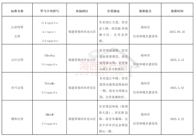 公告透露,“江宸鸣翠公馆”等4处住宅区的命名已经福州市住房和城乡建设局批准,根据《地名管理条例》规定,现予以公告。