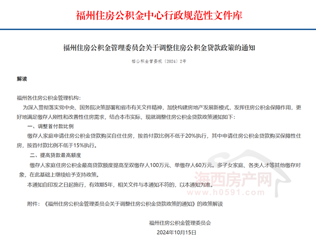 据了解,2024年10月15日,福州住房公积金管理委员会发布“关于调整住房公积金贷款政策的通知(榕公积金管委规〔2024〕2号)”。