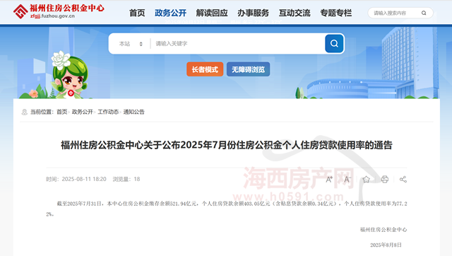 8月11日,福州住房公积金中心发布“关于公布2025年7月份住房公积金个人住房贷款使用率的通告”。