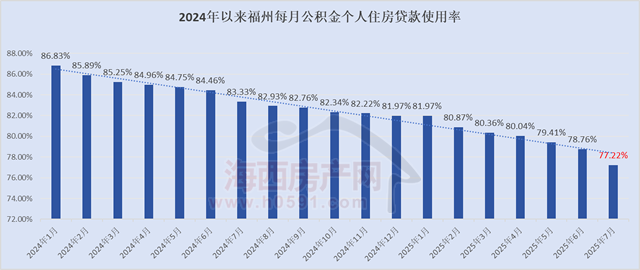 海西房产网统计了2024年1月至2025年7月的个贷使用率情况。从2024年1月的86.83%,逐月下滑。