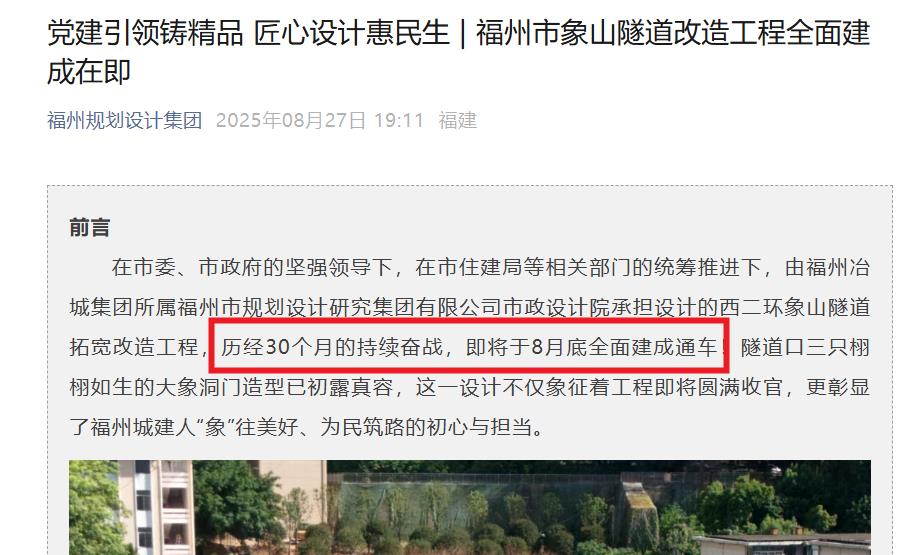 海西房产网(微信公众号:fjhxfcw)消息:据福州规划设计集团2025年8月27日报道,由福州冶城集团所属福州市规划设计研究集团有限公司市政设计院承担设计的西二环象山隧道拓宽改造工程,历经30个月的持续奋战,即将于8月底全面建成通车!