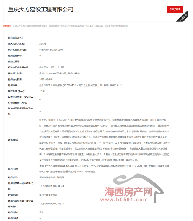 海西房产网(微信公众号:fjhxfcw)消息:2025年8月29日,信用中国(福建福州)发布一则行政处罚信息【榕建罚决﹝2025﹞013号】。