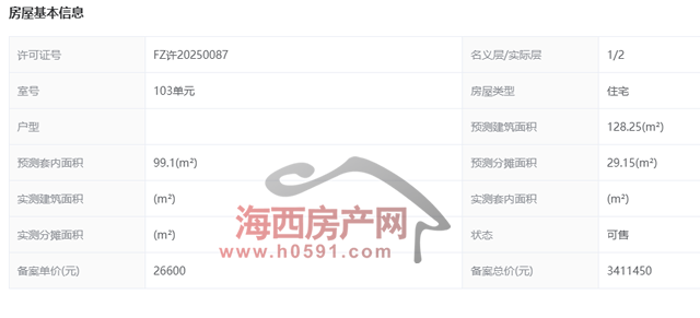 房源楼栋:3#楼;室号:103单元;房屋类型:住宅;预测建筑面积:128.25m²;备案单:26600元/㎡;备案总价:3411450元。
