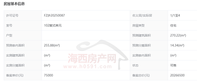房源楼栋:7号楼;室号:102复式单元;房屋类型:住宅;预测建筑面积:270.22m²;备案单:75000元/㎡;备案总价:20266500元。