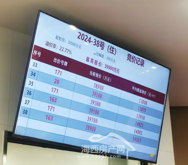 海西房产网(微信公众号:fjhxfcw)通过查询福州土地拍卖记录获悉,2024年9月29日,经过38轮竞价,163竞买人福州建总地产有限公司以3.99亿竞得福州宗地2024-38号,楼面地价14163元/㎡。