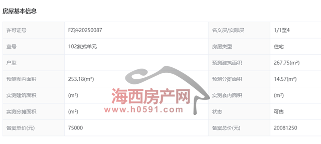房源楼栋:17#楼;室号:102复式单元;房屋类型:住宅;预测建筑面积:267.75m²;备案单:75000元/㎡;备案总价:20081250元。