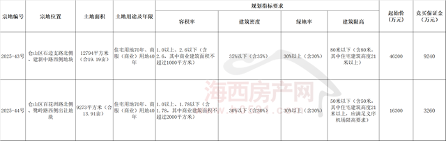 土地面积:12794平方米(合19.19亩);容积率:1.0以上、2.6以下(含2.6,其中商业建筑面积不超过1000平方米);建筑密度:35%以下(含35%);绿地率:30%以上(含30%);建筑限高:80米以下(含80米,其中住宅建筑高度21米以上);出让年限:住宅用地70年、商服(商业)用地40年。