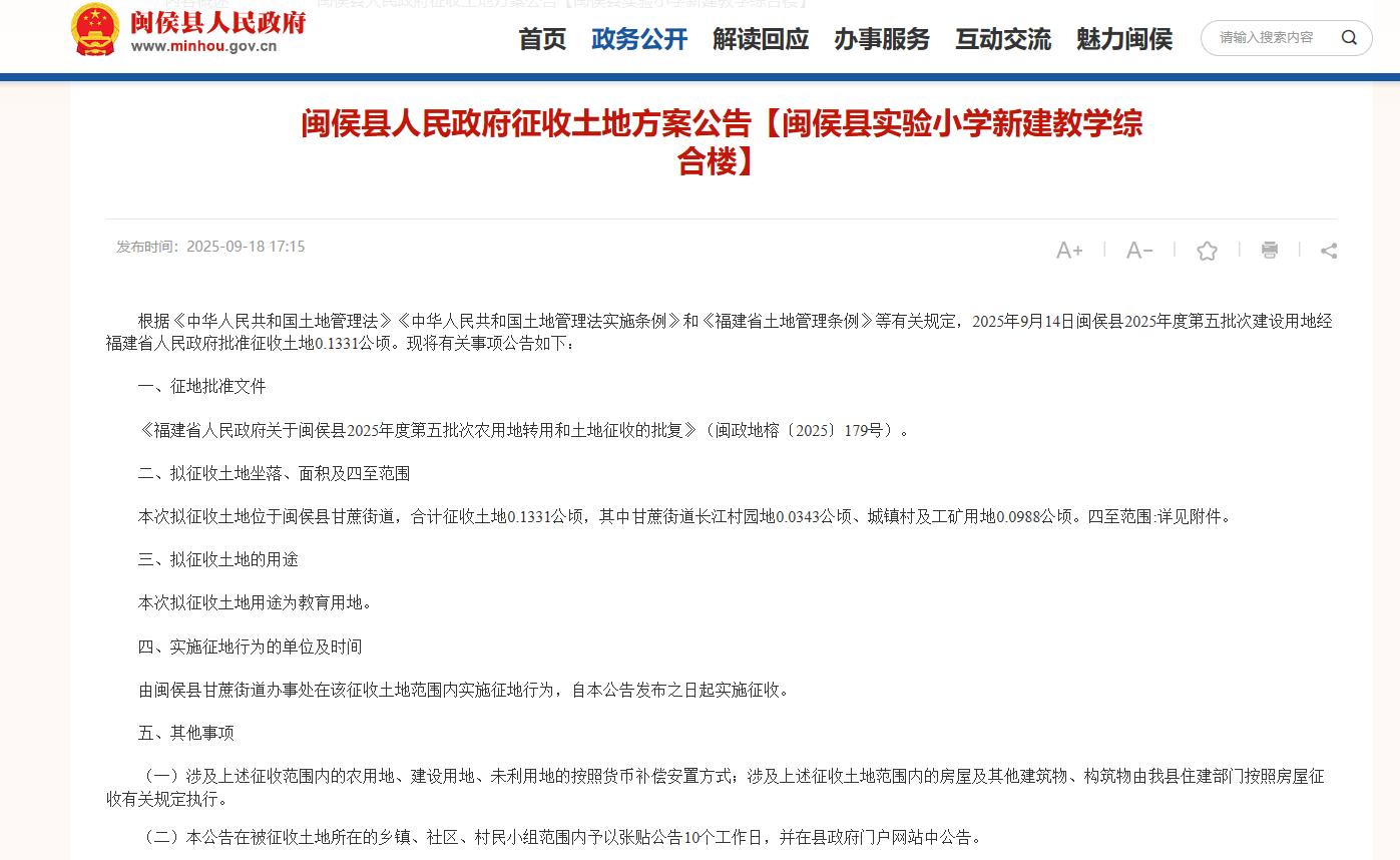 根据《中华人民共和国土地管理法》《中华人民共和国土地管理法实施条例》和《福建省土地管理条例》等有关规定,2025年9月14日闽侯县2025年度第五批次建设用地经福建省人民政府批准征收土地0.1331公顷。现将有关事项公告如下: