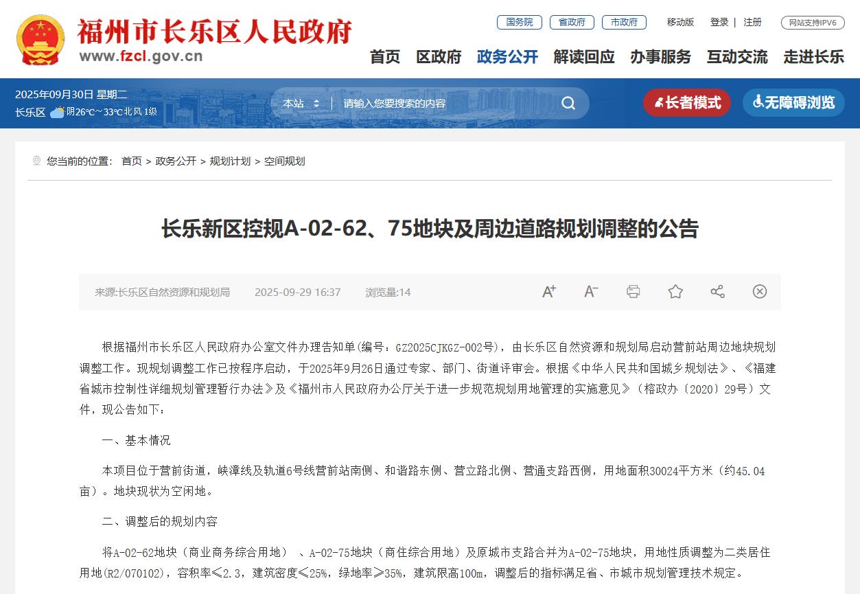 海西房产网(微信公众号:fjhxfcw)消息:2025年9月29日,长乐区自然资源和规划局发布“长乐新区控规A-02-62、75地块及周边道路规划调整的公告”。