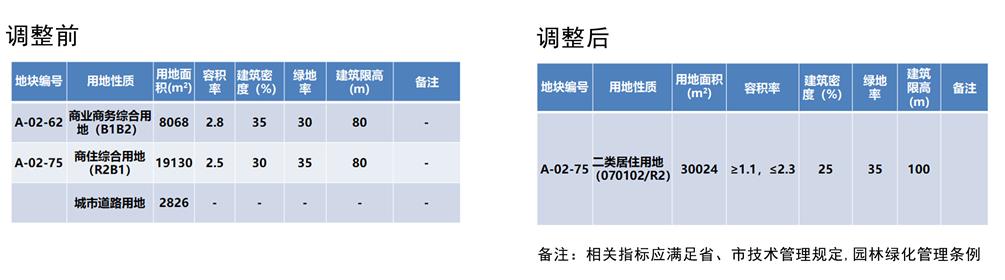 将A-02-62地块(商业商务综合用地) 、A-02-75地块(商住综合用地)及原城市支路合并为A-02-75地块,用地性质调整为二类居住用地(R2/070102),容积率≤2.3,建筑密度≤25%,绿地率≥35%,建筑限高100m,调整后的指标满足省、市城市规划管理技术规定。