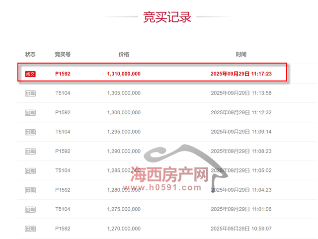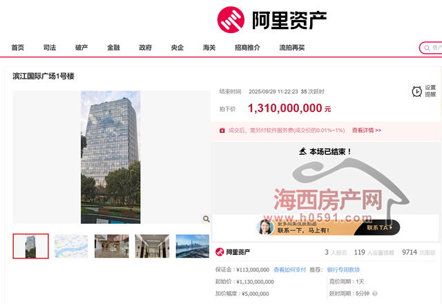 海西房产网(微信公众号:fjhxfcw)消息:阿里资产拍卖平台公布信息显示,9月29日,经过37轮竞价,曾经的闽系千亿房企阳光城总部滨江国际广场1号楼拍卖成交,成交价格为13.1亿元。