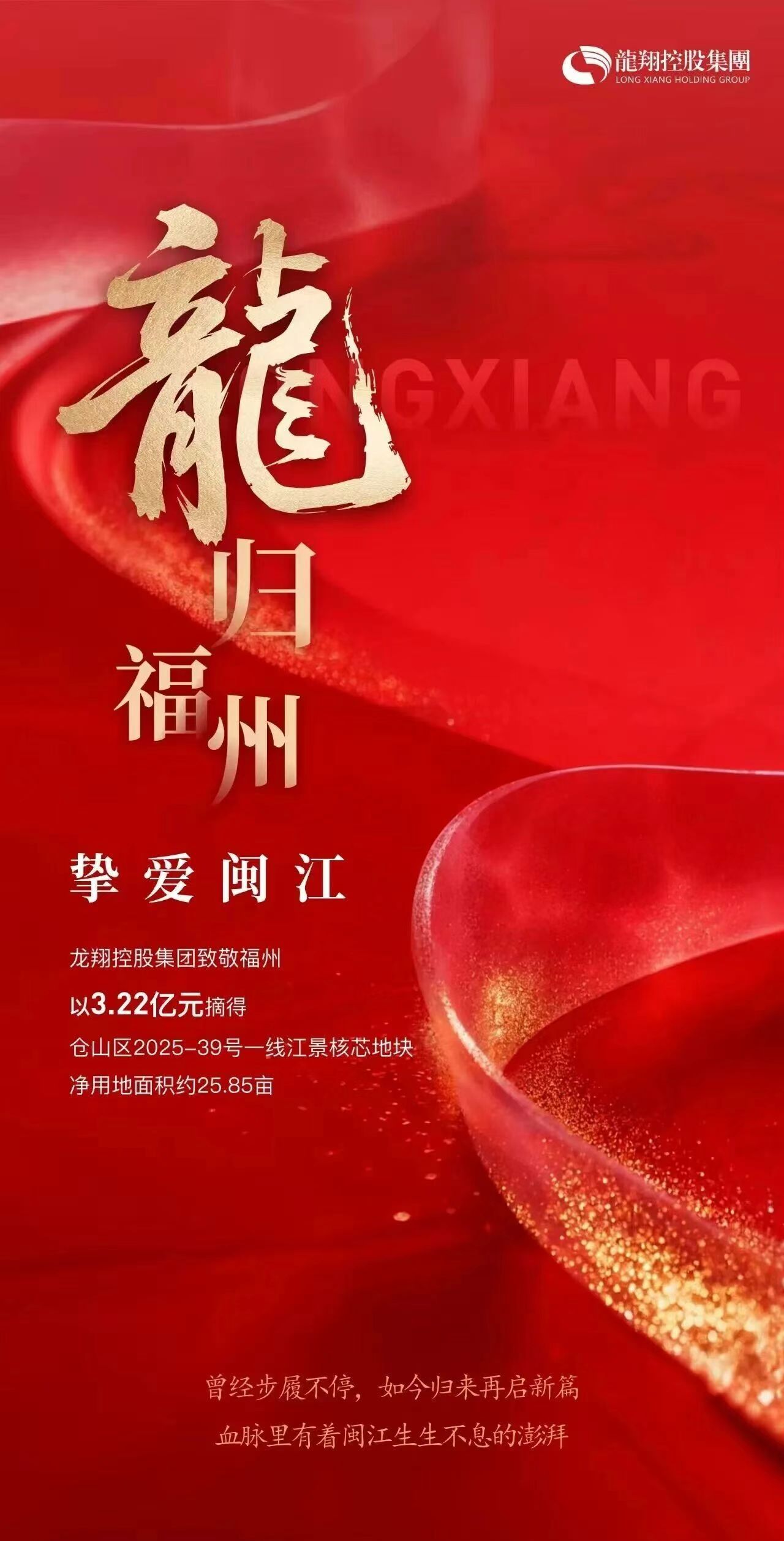 就在9月30日拍卖结束之后,龙翔控股集团对外发布一则微单,宣布以3.22亿元摘得仓山区2025-39号一线江景核芯地块净用地面积约25.85亩。