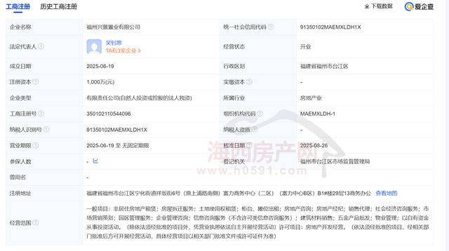 爱企查资料显示,福州兴景置业有限公司成立于2025年6月19日,注册地位于福建省福州市台江区宁化街道祥坂街6号(原上浦路南侧)富力商务中心(二区)(富力中心B区)B1#楼29层13商务办公,法定代表人为吴钊思。