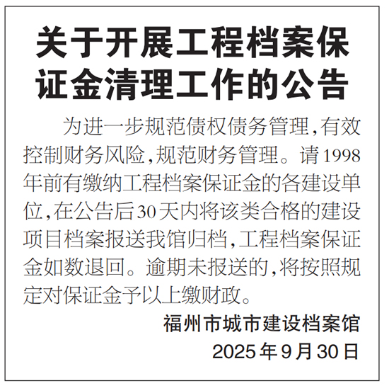 请1998年前有缴纳工程档案保证金的各建设单位,在公告后30天内将该类合格的建设项目档案报送福州市城市建设档案馆归档,工程档案保证金如数退回。