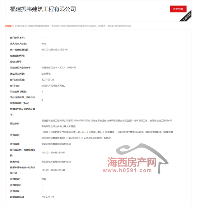 该处罚信息显示,福建振韦建筑工程有限公司于2025年8月15日9时28分在晋安区鼓山镇双福路晋安湖三创园E1地块项目工地,发现存在施工期间未采取有效防尘降尘措施(裸土未覆盖)。