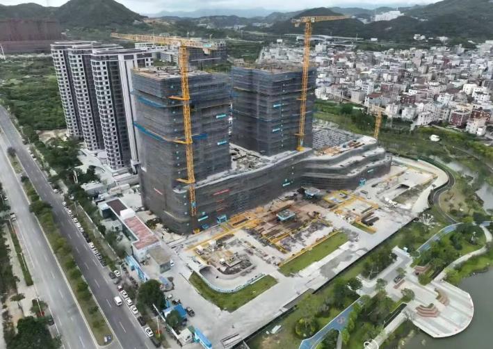 国庆期间,该项目处于主体结构施工阶段,A座办公楼主体结构施工至十七层梁板,B座酒店主体结构施工至十八层墙柱,裙房四层大跨度钢桁架已施工完成,正朝着年底主体结构全面封顶的目标全速迈进。预计2027年建成投用。
