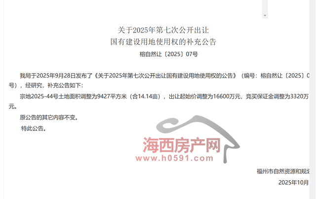 补充公告显示,福州市自然资源和规划局于2025年9月28日发布了《关于2025年第七次公开出让国有建设用地使用权的公告》(编号:榕自然让〔2025〕07号),经研究,补充公告如下: