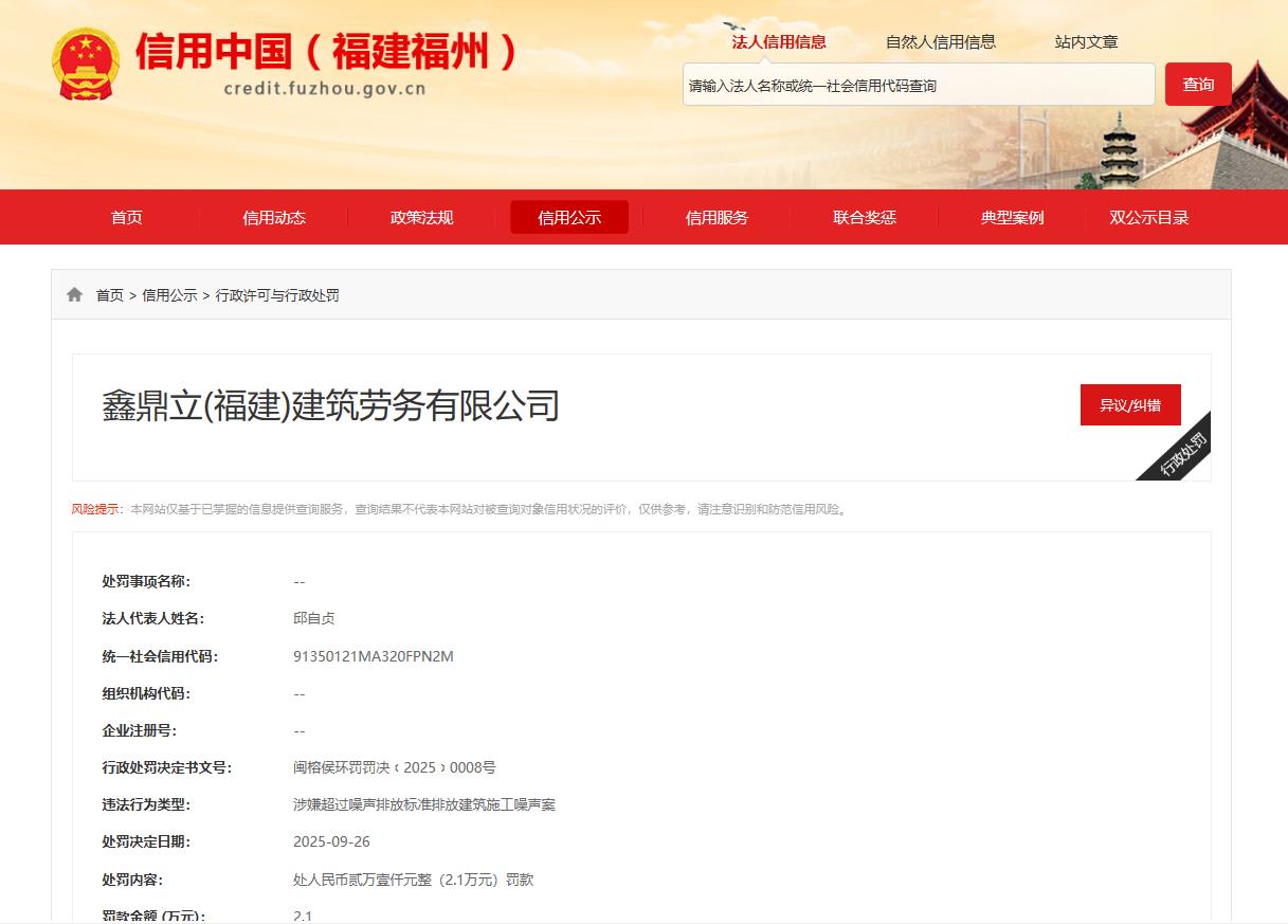 海西房产网(微信公众号:fjhxfcw)消息:2025年10月5日,信用中国(福建福州)发布一则行政处罚信息,鑫鼎立(福建)建筑劳务有限公司因涉嫌超过噪声排放标准排放建筑施工噪声案,被罚2.1万元。