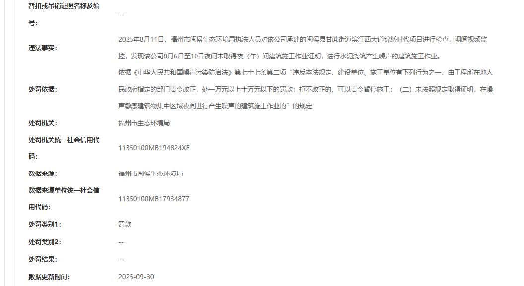违法事实:2025年8月11日,福州市闽侯生态环境局执法人员对该公司承建的闽侯县甘蔗街道滨江西大道锦绣时代项目进行检查,调阅视频监控,发现该公司8月6日至10日夜间未取得夜(午)间建筑施工作业证明,进行水泥浇筑产生噪声的建筑施工作业。
