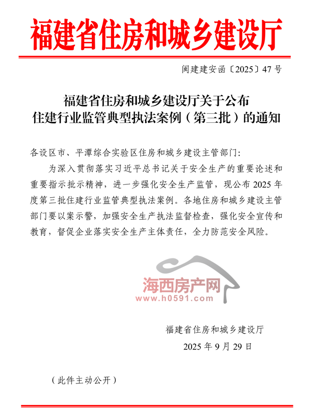 海西房产网(微信公众号:fjhxfcw)消息:9月30日,福建省住房和城乡建设厅发布“关于公布住建行业监管典型执法案例(第三批)的通知(闽建建安函〔2025〕47号)”。