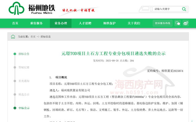 海西房产网(微信公众号:fjhxfcw)消息:9月28日,福州地铁集团官网发布“元璟TOD项目土石方工程专业分包项目遴选失败的公示”。