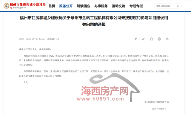 海西房产网(微信公众号:fjhxfcw)消息:9月30日,福州市住房和城乡建设局发布“关于泉州市金帆工程机械有限公司未按时履约影响项目建设相关问题的通报”。