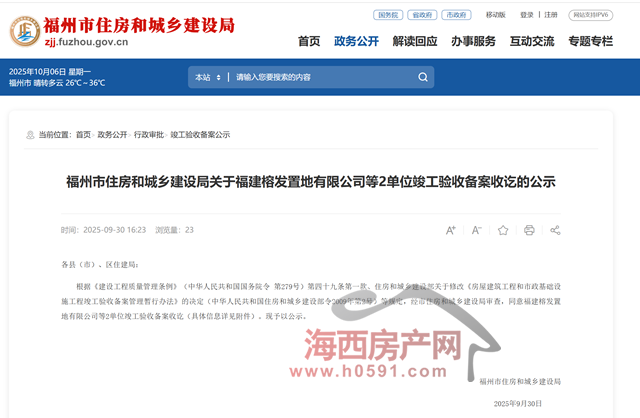 海西房产网(微信公众号:fjhxfcw)消息:9月30日,福州市住房和城乡建设局发布“关于福建榕发置地有限公司等2单位竣工验收备案收讫的公示”。