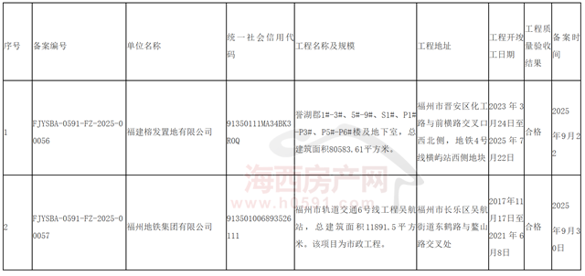 1、誉湖郡1#-3#、5#-9#、S1#、P1#-P3#、P5#-P6#楼及地下室:总建筑面积80583.61平方;单位名称:福建榕发置地有限公司;工程地址:福州市晋安区化工路与前横路交叉口西北侧,地铁4号线横屿站西侧地块;工程开竣工日期:2023年3月24日至2025年7月22日;工程质量验收结果:合格;备案时间:2025年9月22日。