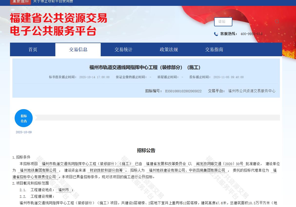 海西房产网(微信公众号:fjhxfcw)消息:2025年10月9日,福州市公共资源交易服务中心发布“福州市轨道交通线网指挥中心工程(装修部分)(施工)”。