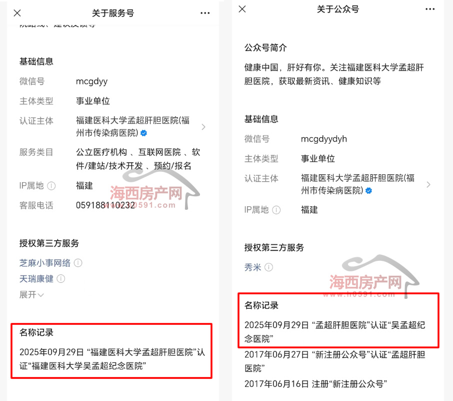 海西房产网(微信公众号:fjhxfcw)消息:2025年9月29日,孟超肝胆医院官方公众号正式更名,认证为“吴孟超纪念医院”。服务号则从“福建医科大学孟超肝胆医院”认证为“福建医科大学吴孟超纪念医院”。