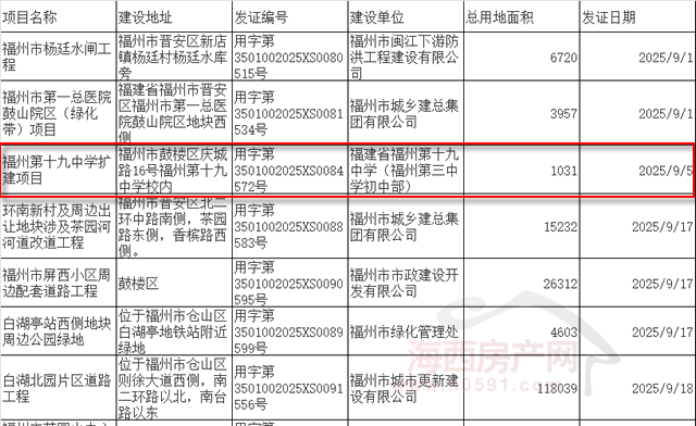 其中,福州第十九中学扩建项目已于2025年9月5日取得建设项目选址意见书,总用地面积1031
