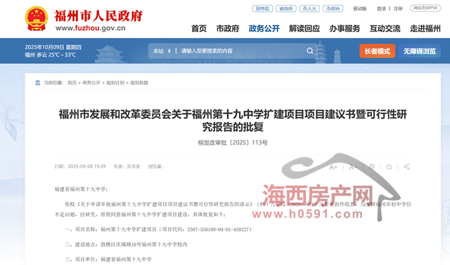 2025年9月8日,福州市发改委发布“关于福州第十九中学扩建项目项目建议书暨可行性研究报告的批复(榕发改审批〔2025〕113号)”。