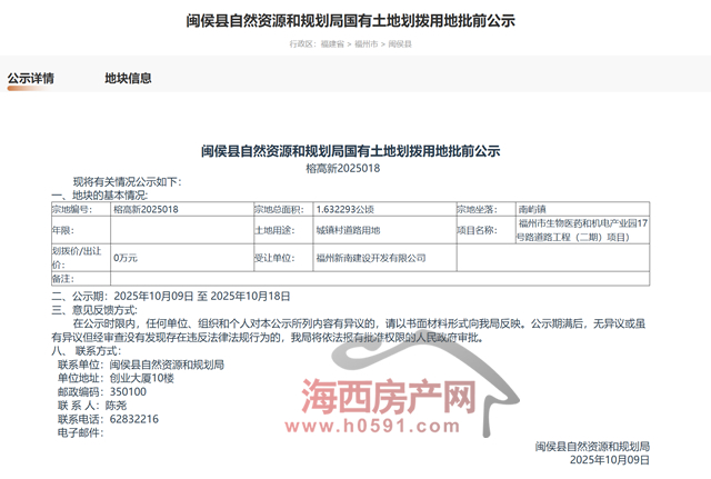 该地块编号“榕高新2025018”,面积1.632293公顷(24.48亩)。根据约定,该地块用于建设 福州市生物医药和机电产业园17号路道路工程(二期)项目。