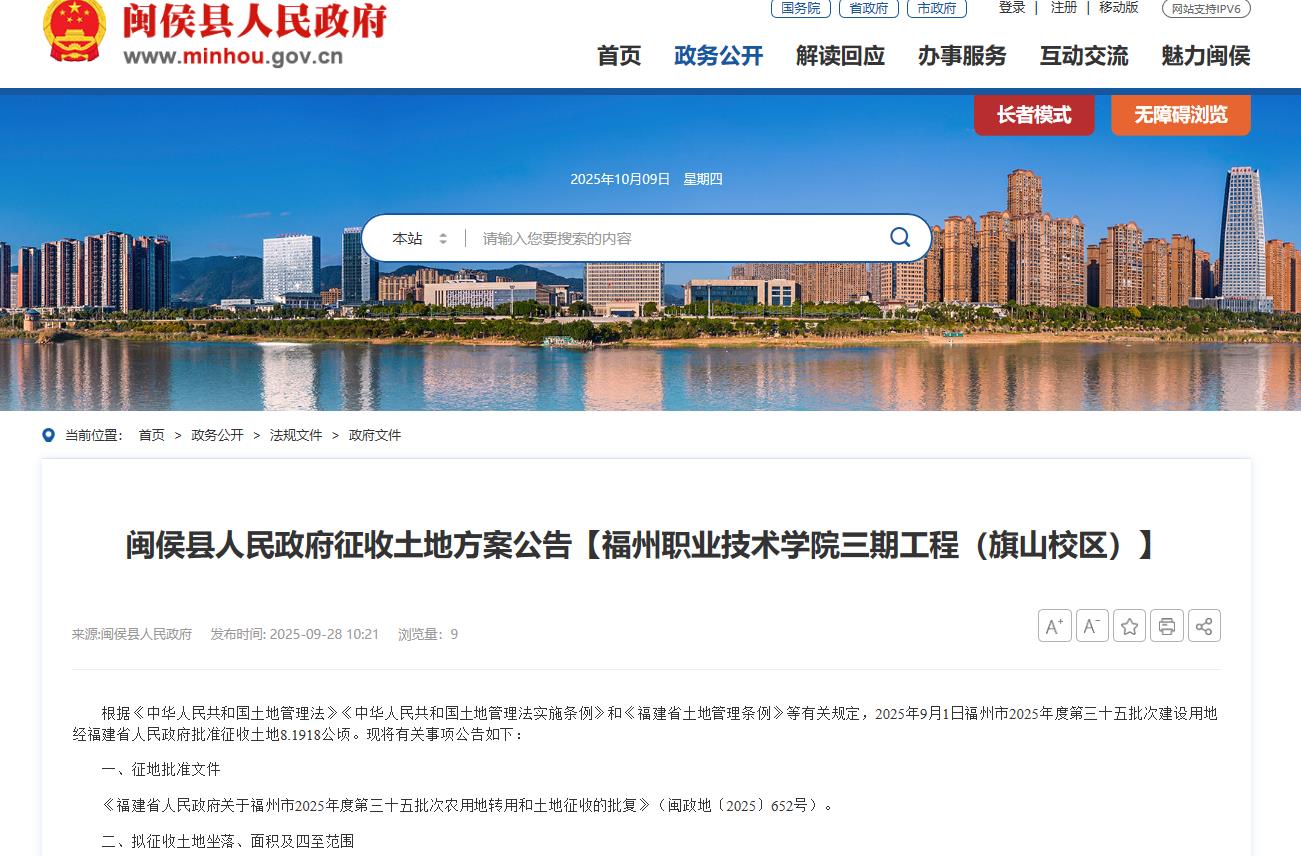 2025年9月27日,闽侯县人民政府发布“征收土地方案公告【福州职业技术学院三期工程(旗山校区)】 ”。这也意味着,福州大学城又一所高校将扩建。