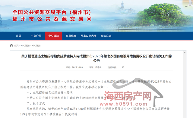 海西房产网(微信公众号:fjhxfcw)消息:10月9日,福州市公共资源交易服务中心发布“关于摇号遴选土地招标拍卖挂牌主持人完成福州市2025年第七次国有建设用地使用权公开出让相关工作的公告”。