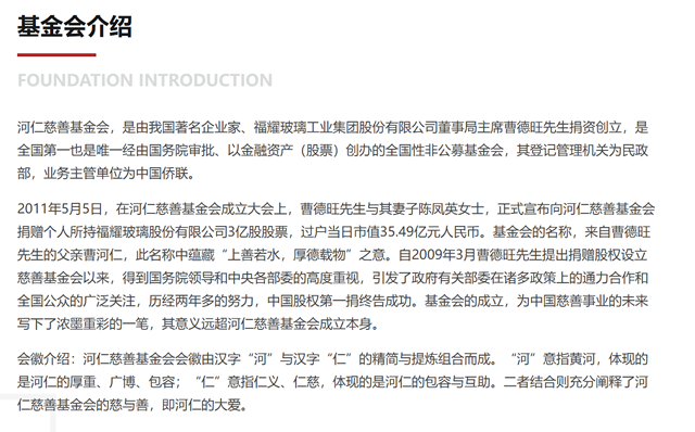 根据官网介绍,河仁慈善基金会,是由我国著名企业家、福耀玻璃工业集团股份有限公司董事局主席曹德旺先生捐资创立,是全国第一也是唯一经由国务院审批、以金融资产(股票)创办的全国性非公募基金会,其登记管理机关为民政部,业务主管单位为中国侨联。