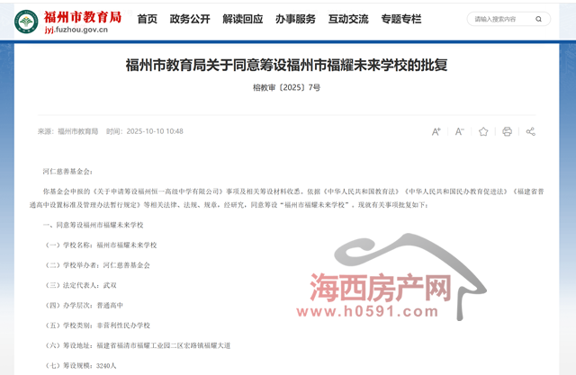 海西房产网(微信公众号:fjhxfcw)消息:10月10日,福州市教育局发布“关于同意筹设福州市福耀未来学校的批复(榕教审〔2025〕7号)”。