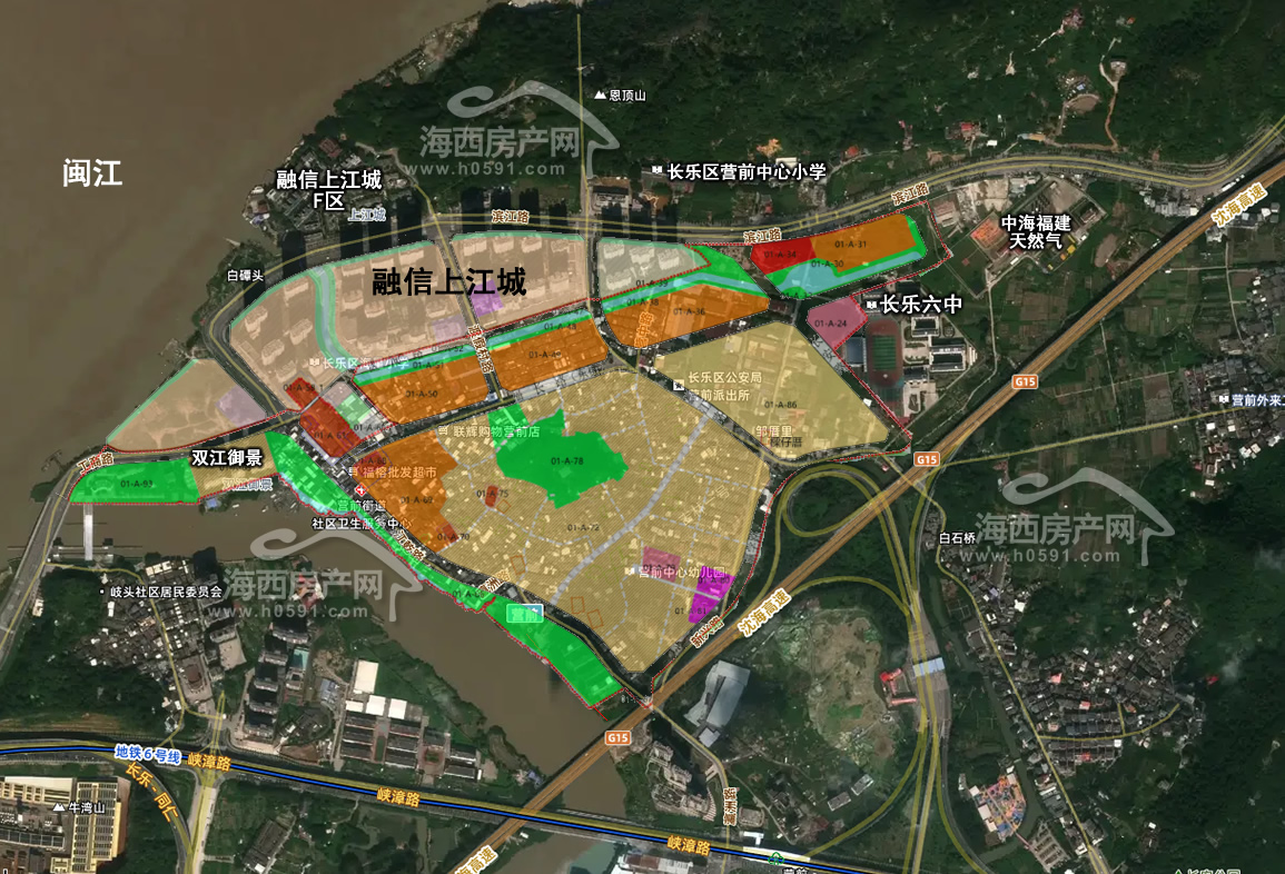 本项目位于长乐新区控规350182-A分区单元A-01基本单元,西邻洞江,东至长乐六中附近,北临已建融信上江城,南邻沈海高速。