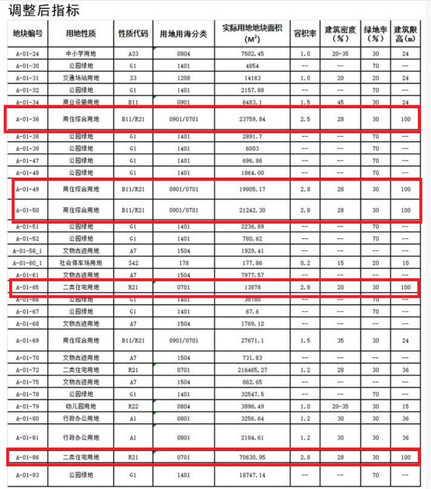 地块编号A-01-36,用地性质为商住综合用地,面积23759.94平米,建筑限高100米,容积率1.5,建筑密度28%,绿地率30%。