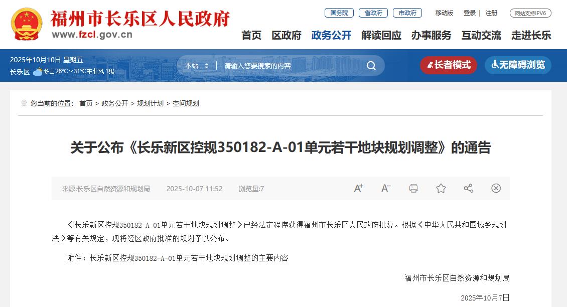 海西房产网(微信公众号:fjhxfcw)消息:2025年10月7日,福州市长乐区自然资源和规划局发布“关于公布《长乐新区控规350182-A-01单元若干地块规划调整》的通告 ”。