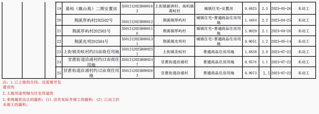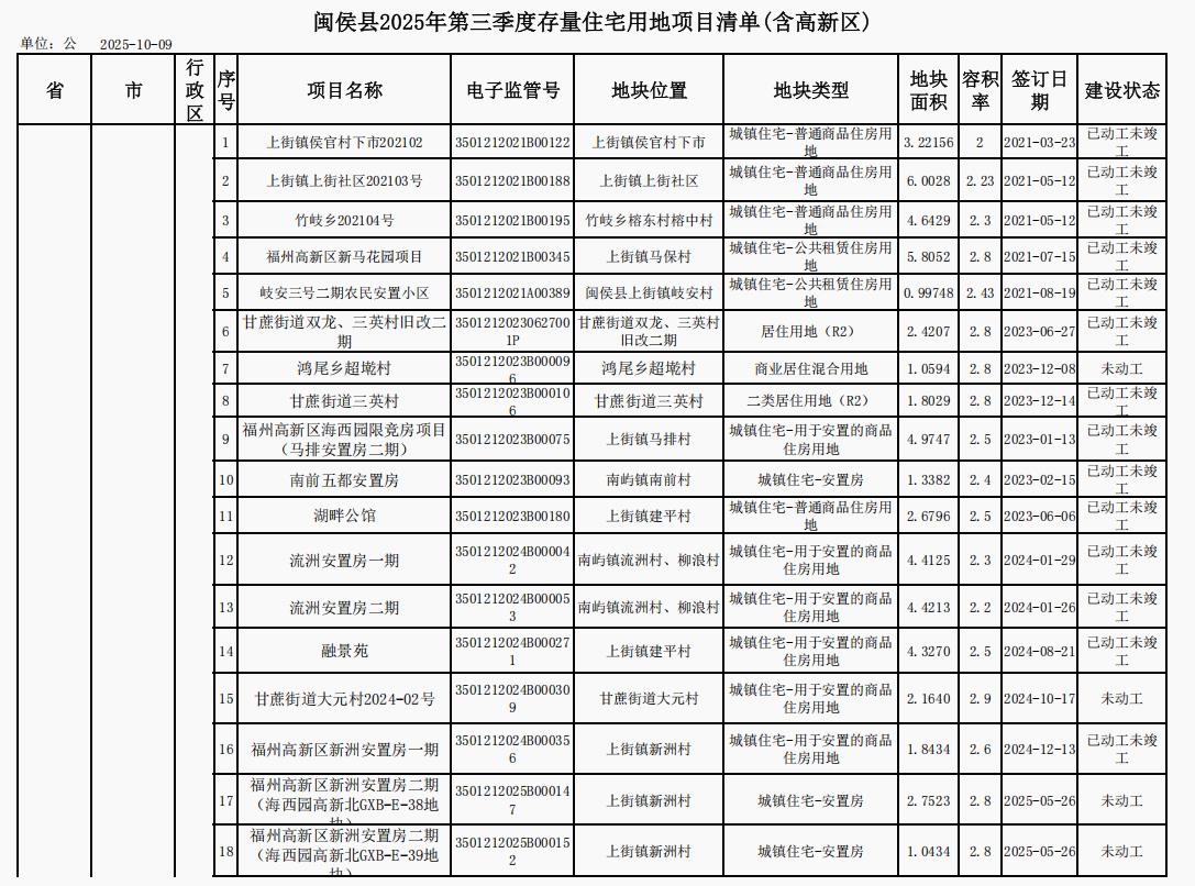 闽侯县2025年第三季度存量住宅用地汇总表(含高新区)显示,项目共有25个,总面积63.9949公顷(折合959.92亩),未动工面积15.1047公顷,已劝工未竣工面积48.8902公顷。