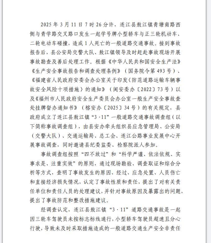 经调查认定,连江县敖江镇“3·11”道路交通事故是一起因三轮车驾驶员未按标志标线通行,小型轿车驾驶员超速且分心行驶,导致未及时采取措施造成的一般道路交通生产安全非责任事故。