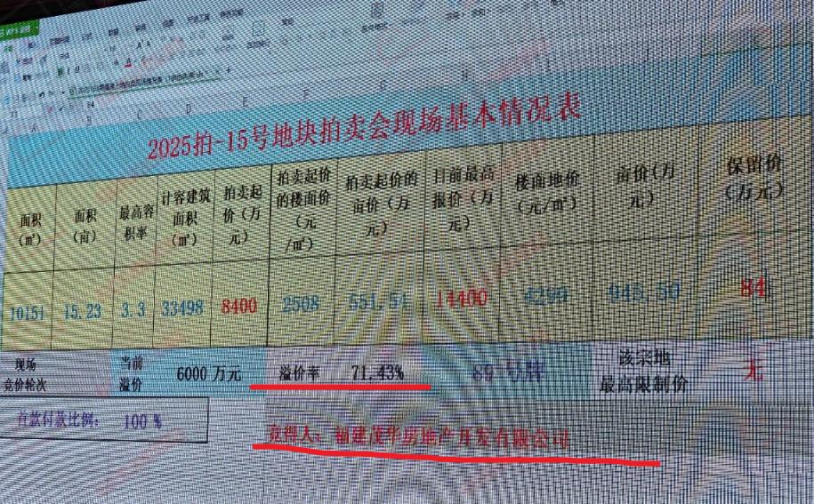 最终,经过多轮激烈竞价,福建茂华房地产开发有限公司以1.44亿成功摘得该地块,成交楼面价4299元/㎡。溢价6000万元,溢价率达71.43%。