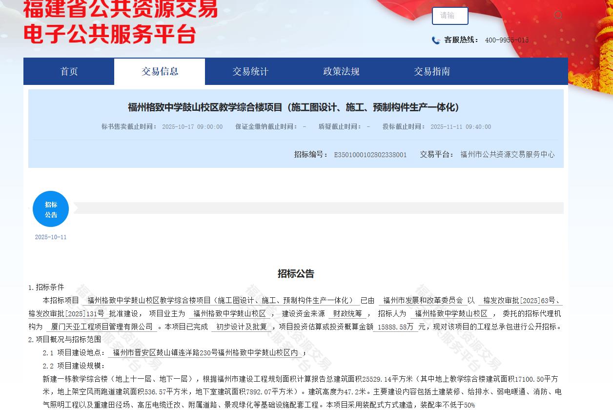 福州格致中学鼓山校区教学综合楼项目(施工图设计、施工、预制构件生产一体化)已由 福州市发展和改革委员会以 榕发改审批[2025]63号、榕发改审批[2025]131号批准建设, 项目业主为 福州格致中学鼓山校区, 建设资金来源 财政统筹, 招标人为 福州格致中学鼓山校区, 委托的招标代理机构为 厦门天亚工程项目管理有限公司。