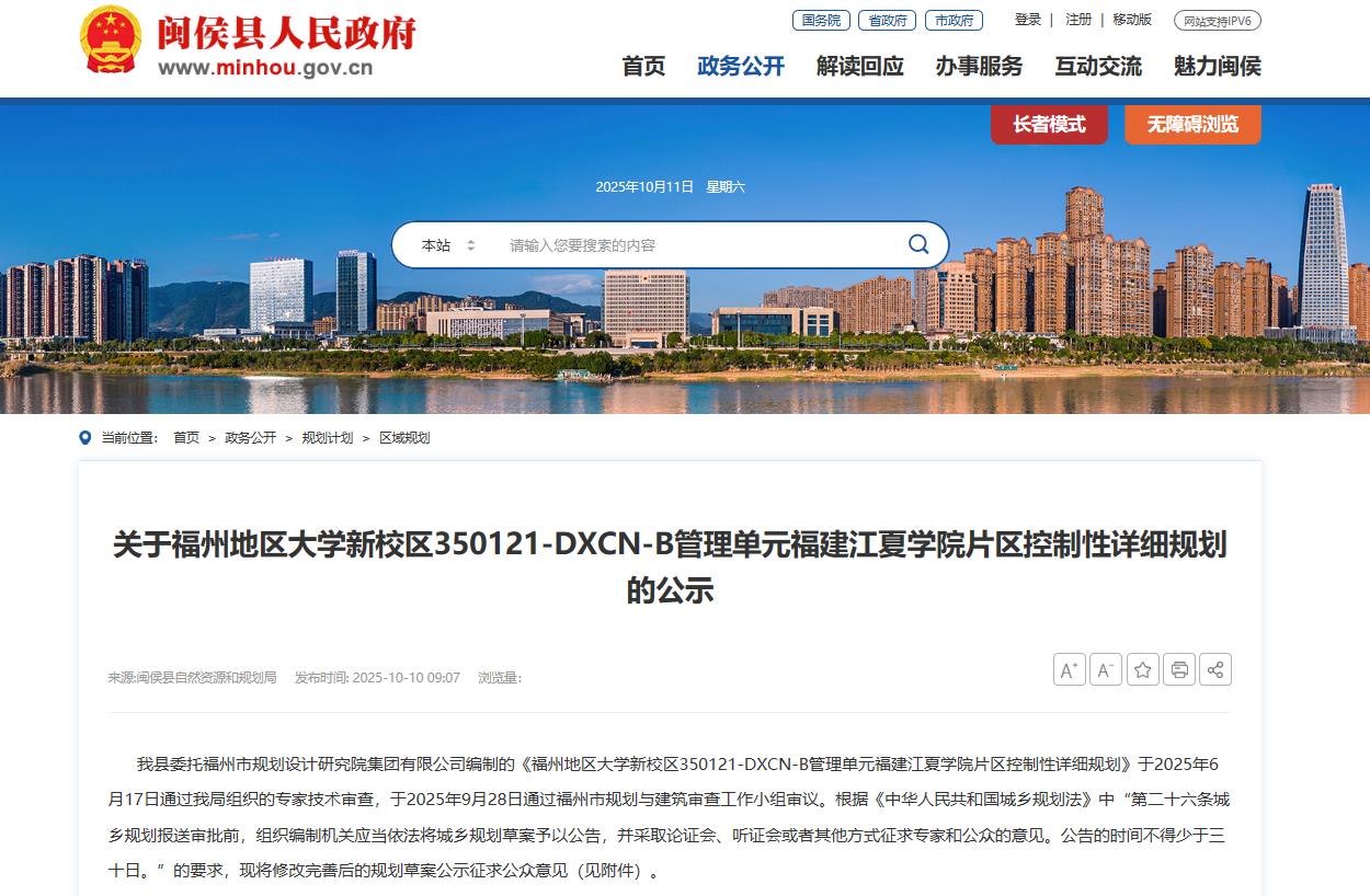 我县委托福州市规划设计研究院集团有限公司编制的《福州地区大学新校区350121-DXCN-B管理单元福建江夏学院片区控制性详细规划》于2025年6月17日通过我局组织的专家技术审查,于2025年9月28日通过福州市规划与建筑审查工作小组审议。