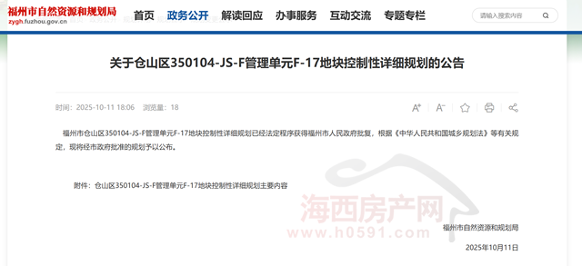 海西房产网(微信公众号:fjhxfcw)消息:10月11日, 福州市自然资源和规划局发布“关于仓山区350104-JS-F管理单元F-17地块控制性详细规划的公告”。